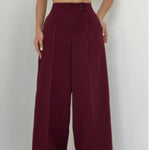 Parte da cintura assimétrica: Na parte da frente das calças, foi adicionado um fecho diagonal, que confere um visual único e moderno ao usá-las. Este pequeno detalhe dá um novo toque à sua personalidade, sem ser muito chamativo. O fecho com dois botões garante um ajuste seguro e proporciona um visual deslumbrante.