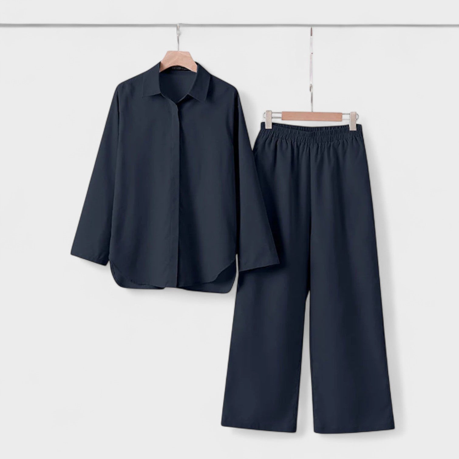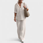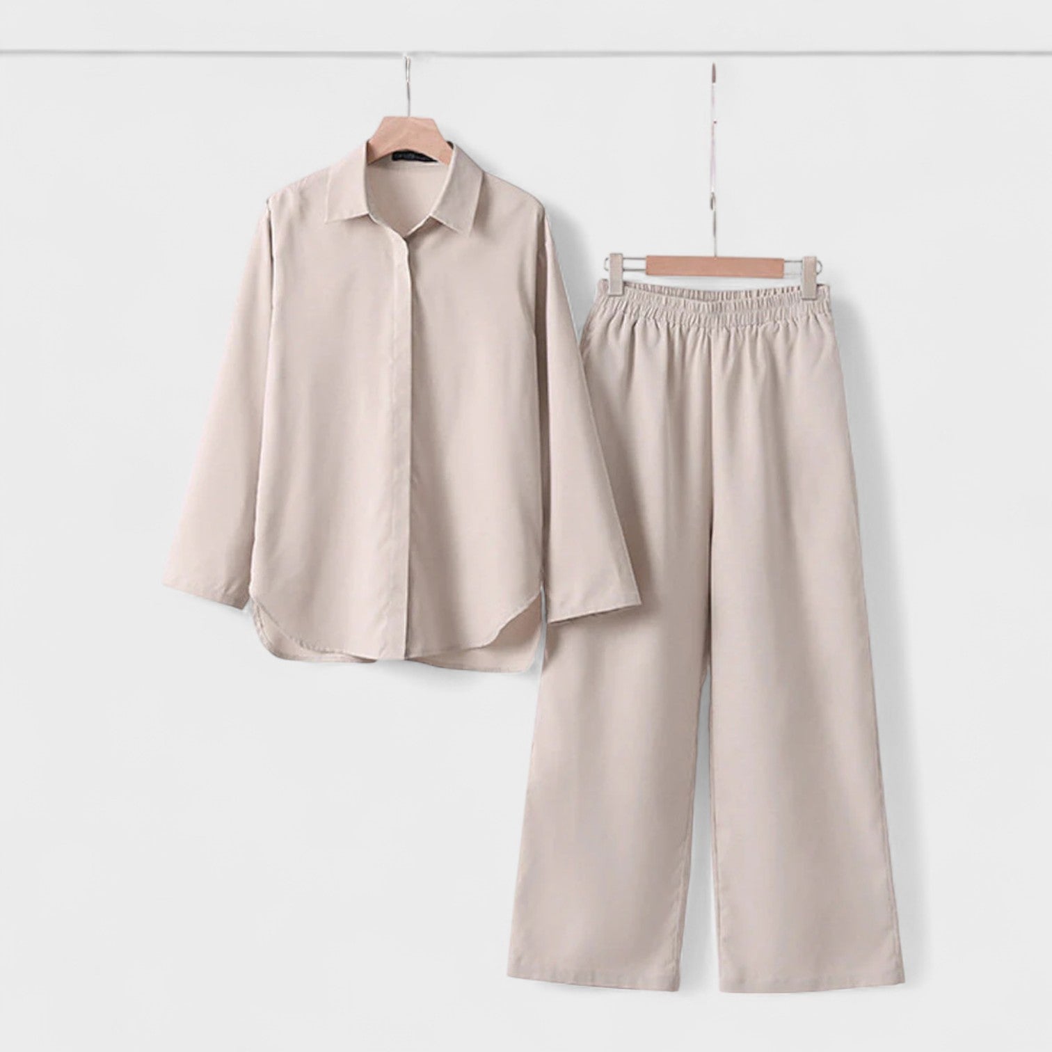 Este conjunto de linho une elegância natural e praticidade com um toque moderno. Com uma camisa de corte solto e calças retas de caimento leve, é ideal para quem busca um look sofisticado sem abrir mão do conforto.