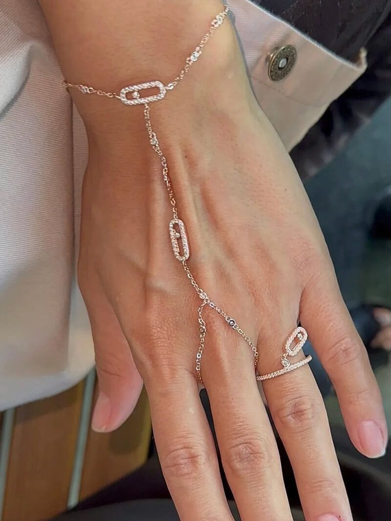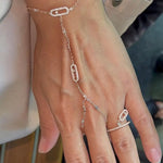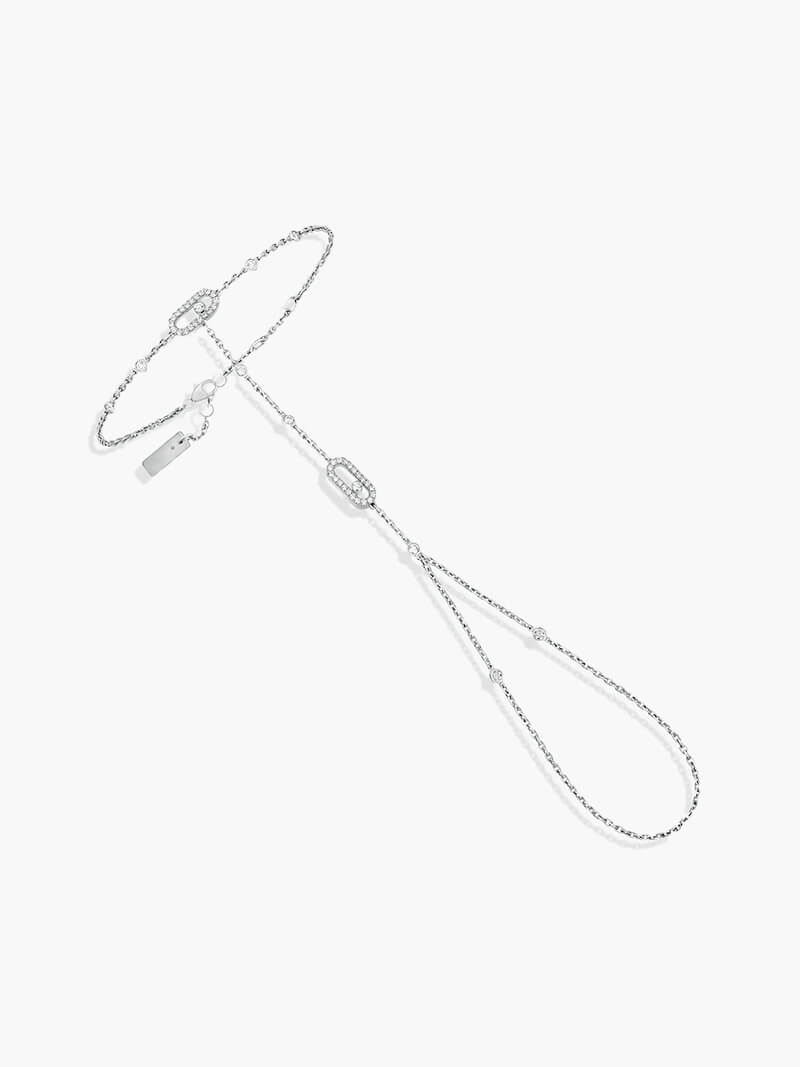 Nossa exquisita corrente de mão Melissa em ouro amarelo ou prata e diamantes é caracterizada por um diamante brilhante em corte movente. O design filigrana com um elegante tratamento pavé enfatiza o brilho dos diamantes.