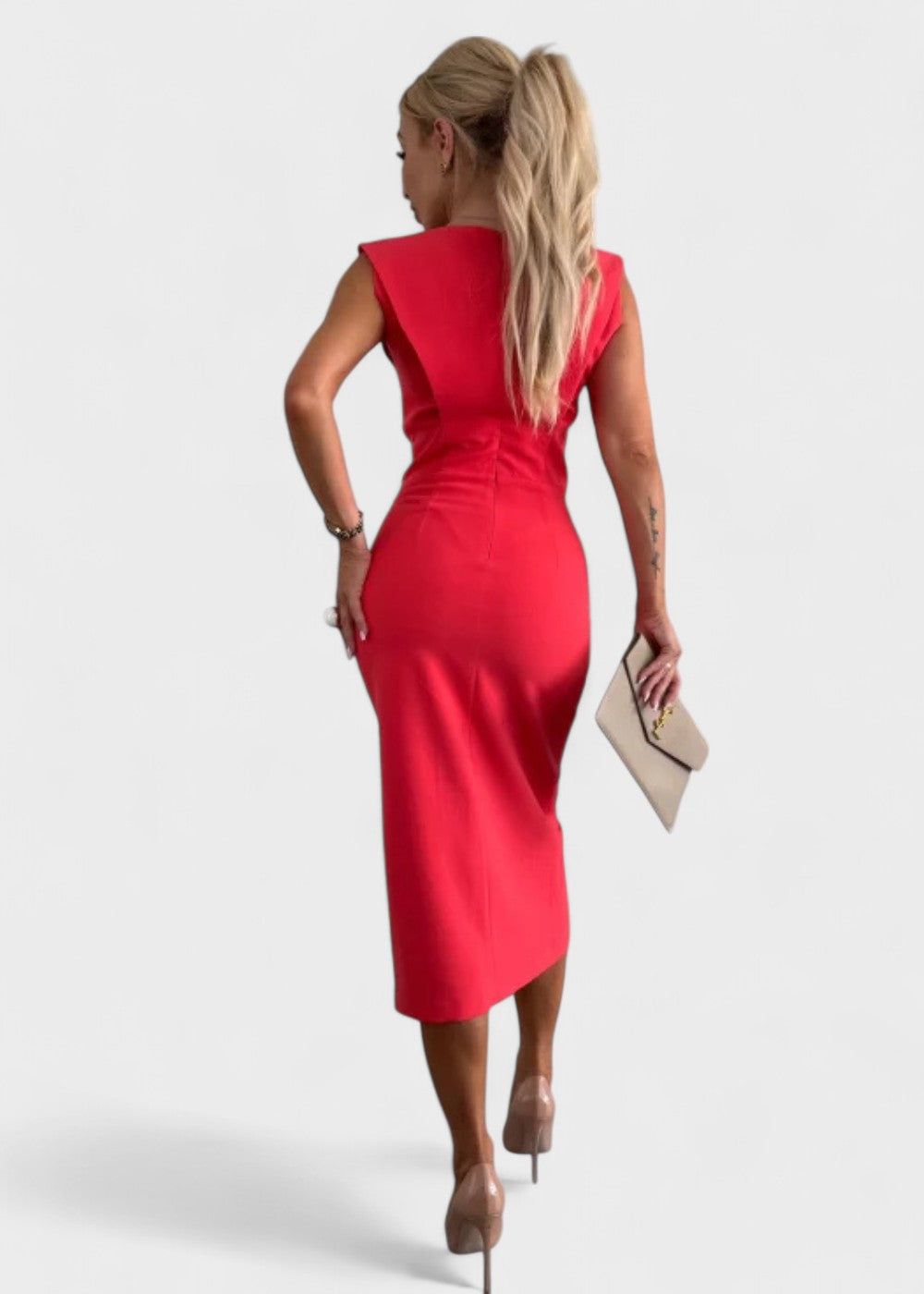 O vestido é a definição de vestuário poderoso. Com o seu corte justo, a elegante fenda nas pernas e as linhas simples e sem mangas, centra-se na elegância minimalista com o máximo impacto - perfeito para negócios, eventos ou noites exclusivas.