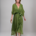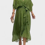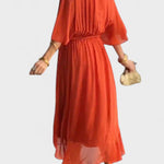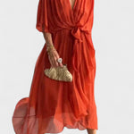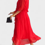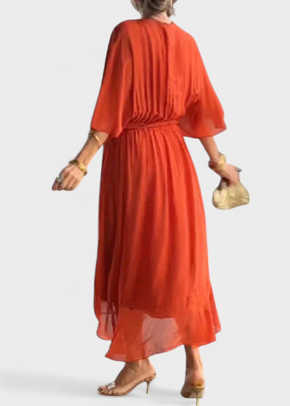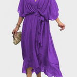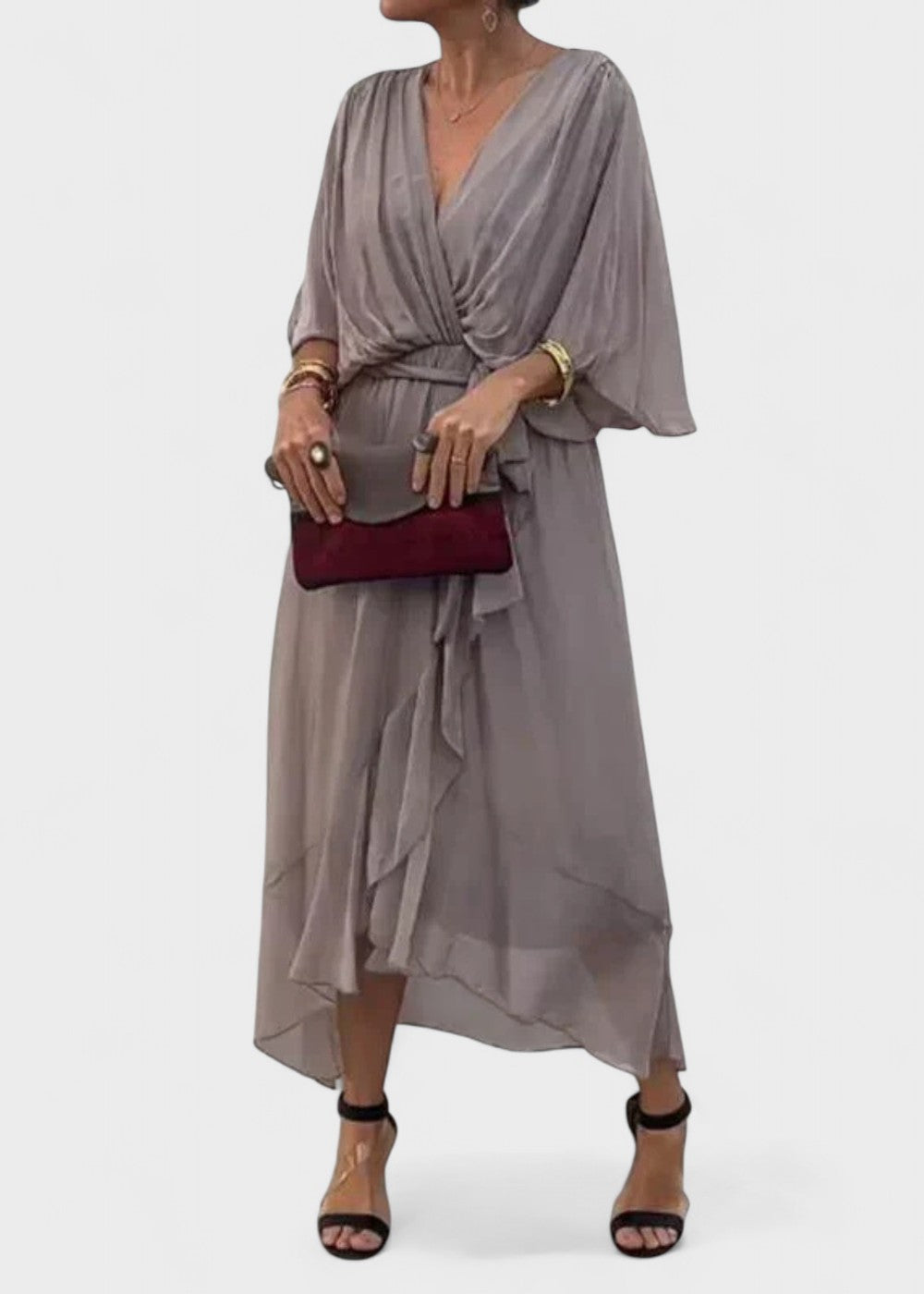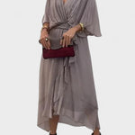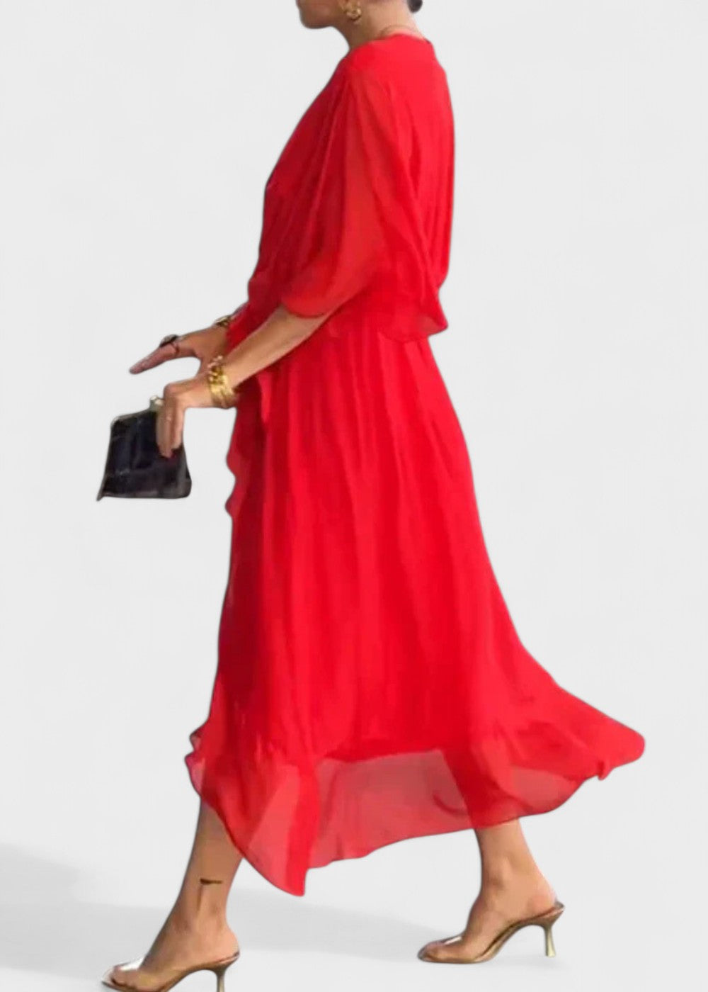 O vestido Monica chiffon midi com um look envolvente acrescenta uma leveza elegante ao seu visual. Com a sua delicada silhueta envolvente, mangas semi-transparentes e bainha assimétrica, realça a graça feminina - perfeito para ocasiões de verão, jantares ou eventos formais.
