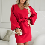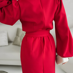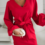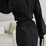 O vestido que transforma a tua presença assim que o vestes. Caimento elegante, mangas amplas modernas e um laço que afina a silhueta — perfeito para quem procura sofisticação sem esforço.