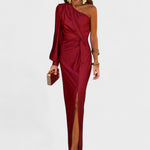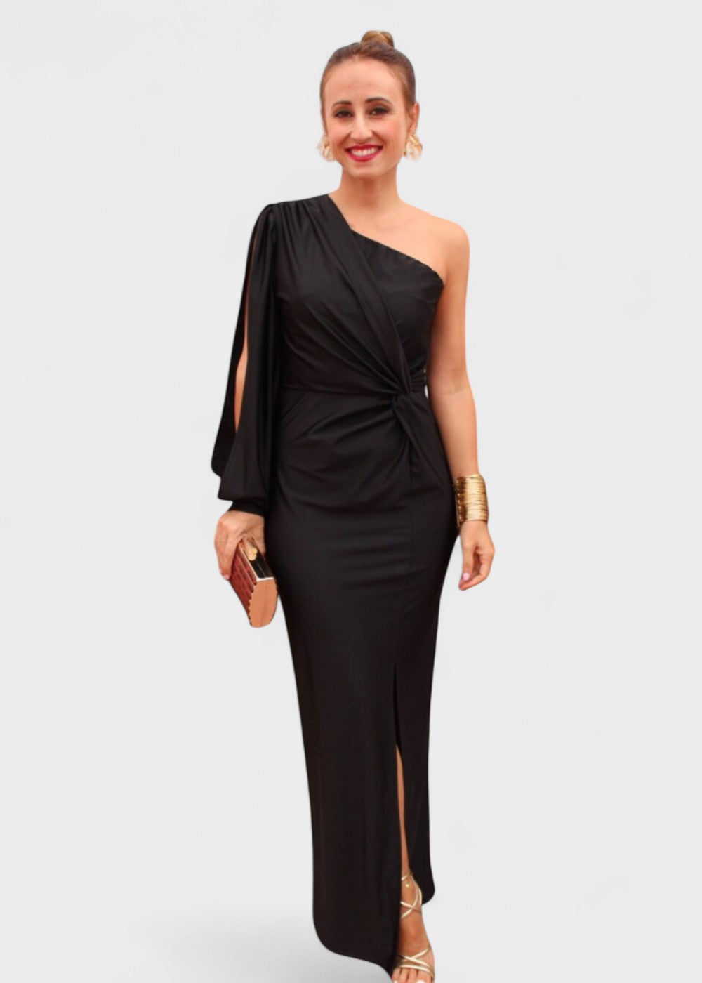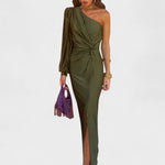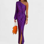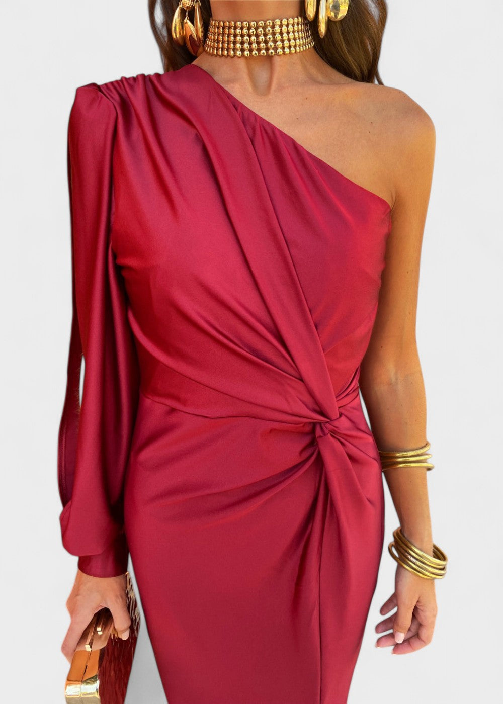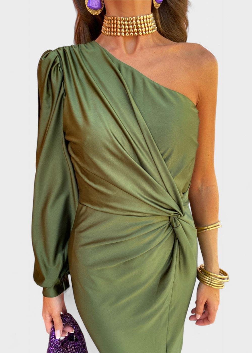 O nosso Vestido de um ombro só com drapeado e nó é a resposta à pergunta: “O que é que eu visto quando quero estar deslumbrante?” Com os seus ombros assimétricos, drapeado artístico e pormenor de nó que envolve a figura, este vestido é feito para momentos especiais.