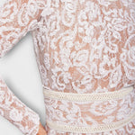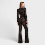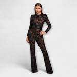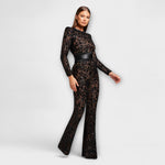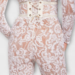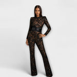 O Macacão Theresia de renda com corpete une a transparência romântica a uma silhueta moderna. A renda artística em design floral se ajusta suavemente ao corpo, enquanto o corpete integrado com fechamento de cadarço acentua a cintura para um visual que valoriza a figura. Perfeito para eventos elegantes, jantares sofisticados ou como uma alternativa ao clássico vestido de noite.