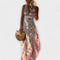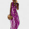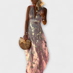 Vestido elegante com decote em V e decoração brilhante de paetês. Este vestido é perfeito para dias quentes e atividades ao ar livre graças à qualidade do tecido leve e ao caimento solto, que proporciona uma sensação de conforto e liberdade de movimento.