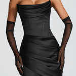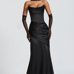 O Vestido Maxi Kensington em preto é uma escolha luxuosa e sofisticada para qualquer ocasião formal. O tecido de cetim com elasticidade cai elegantemente na saia evasê com cauda, enquanto o decote sem alças e o corpete estruturado criam uma silhueta lisonjeira. O decote drapeado e as costas com cordão adicionam um toque de detalhe intrincado.